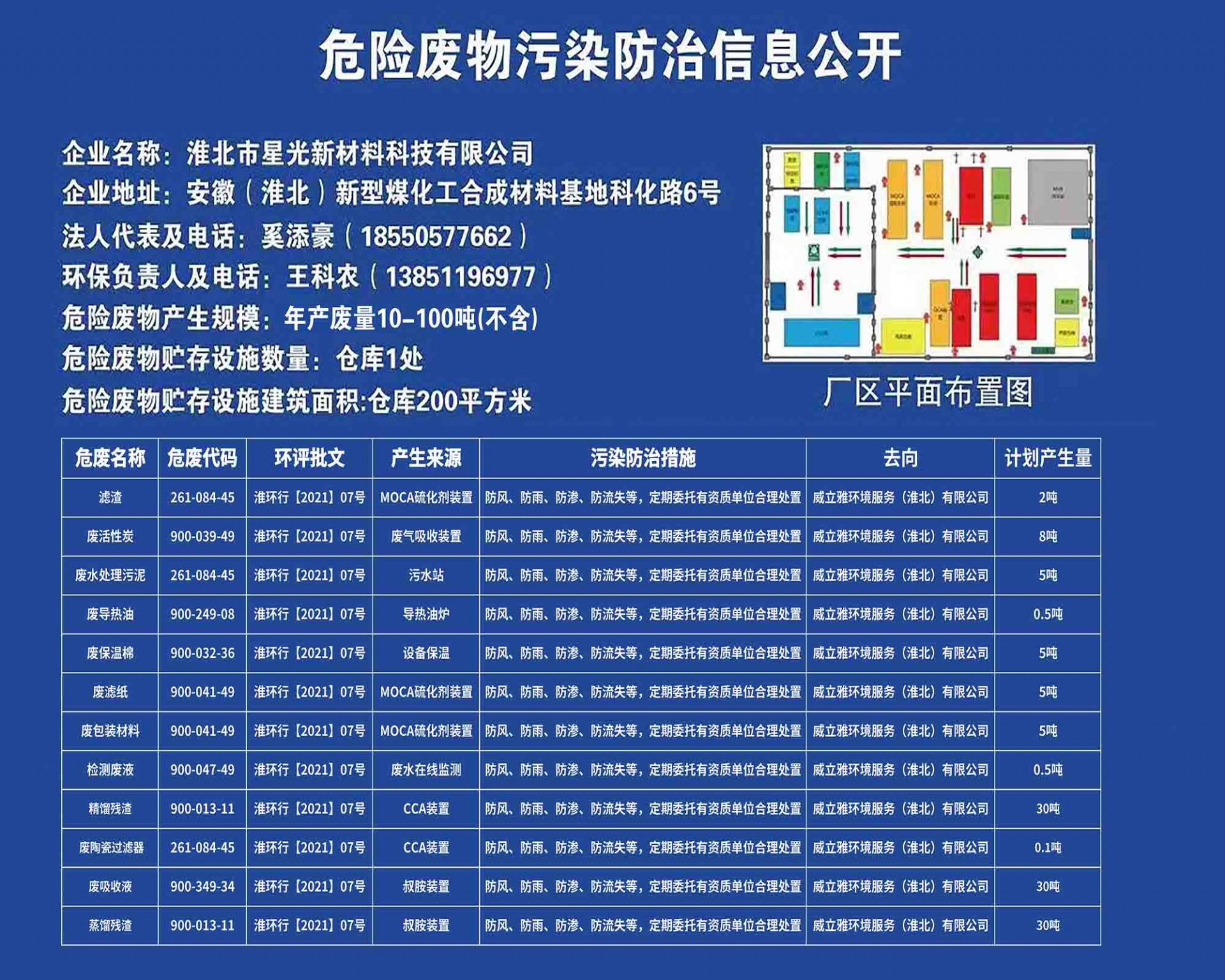 淮北市星光新材料科技有限公司10000t/a聚氨酯橡膠硫化劑MOCA、10000t/a鄰氯苯胺項目(一期)配套建設的環(huán)境保護設施調試時間延期公示根據(jù)關于發(fā)布《建設項目竣工環(huán)境保護驗收暫行辦法》的公告(國環(huán)規(guī)評[2017]4號)的要求,我公司10000t/a聚氨酯橡膠硫化劑MOCA、10000t/a鄰氯苯胺項目(一期)配套建設的環(huán)境保護設施調試起止日期為2021年11月19日——2022年2月18日